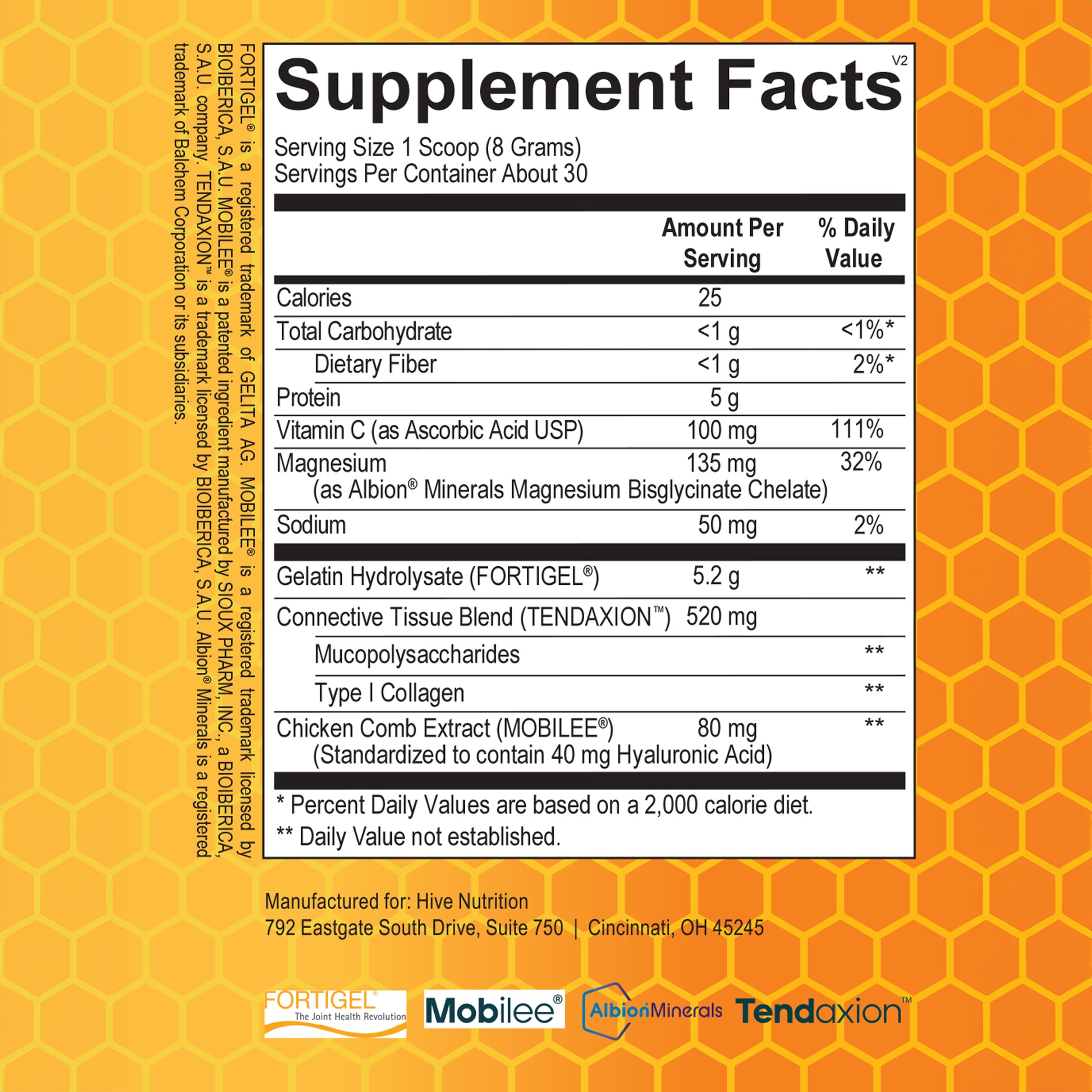 Ingredients: Gelatin Hydrolysate (FORTIGEL¨ Type I Collagen), Chicken Comb Extract (MOBILEE¨), Vitamin C (Ascorbic Acid), Magnesium (Albion¨ Minerals Magnesium Bisglycinate Chelate).
