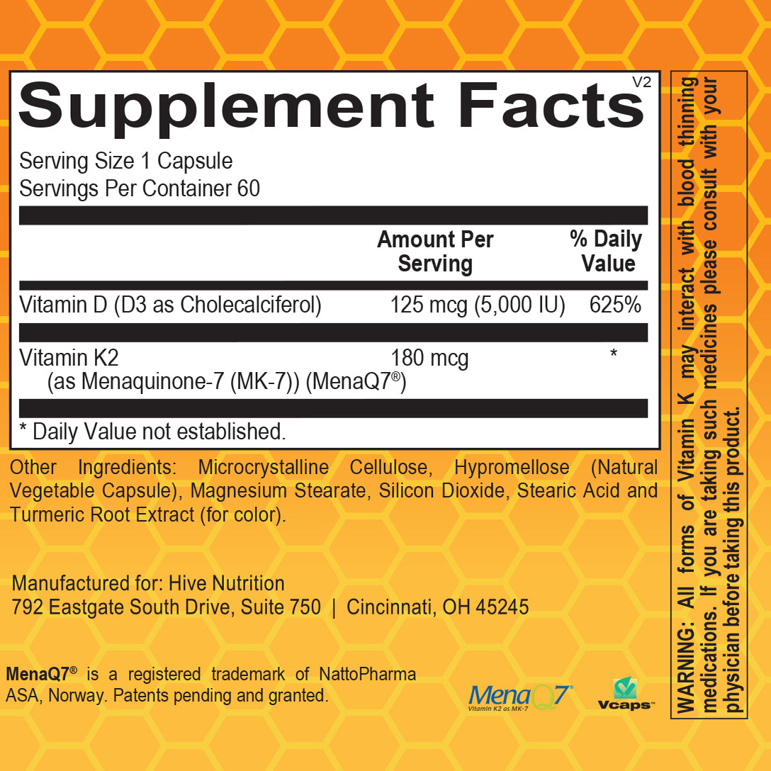 Ingredients: Vitamin D3 (Cholecalciferol), Vitamin K2 (MenaQ7¨ MK-7). Other Ingredients: Microcrystalline Cellulose, Hypromellose (Vegetable Capsule), Magnesium Stearate, Silicon Dioxide, Stearic Acid, Turmeric Root Extract (for color).