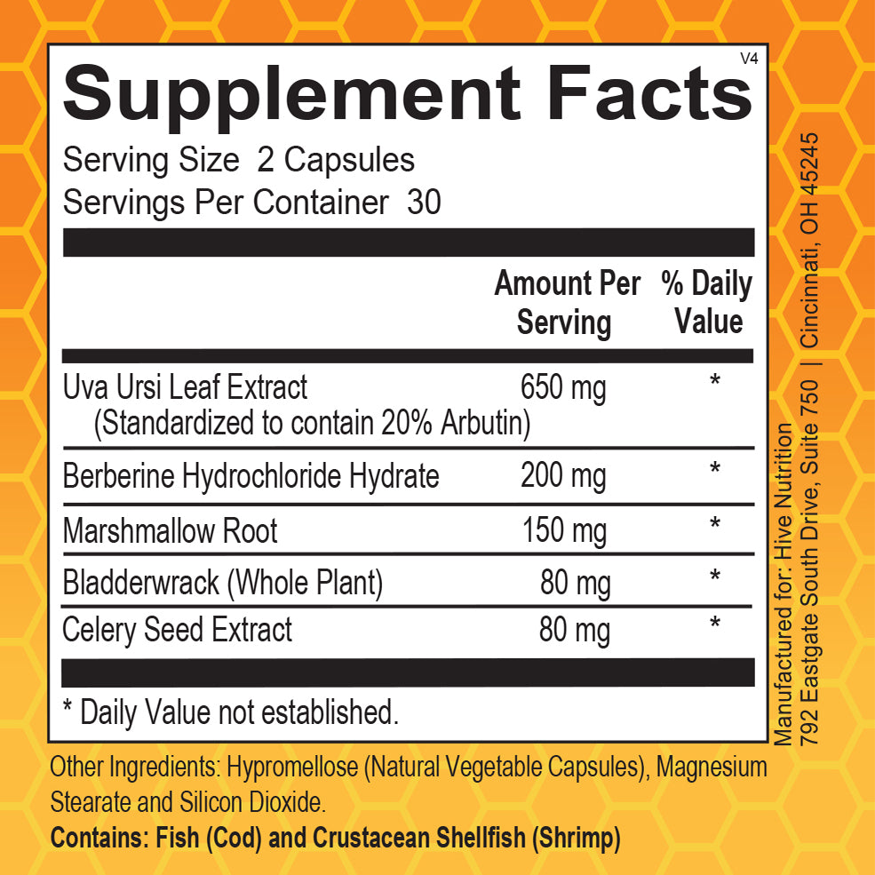 Ingredients: Uva Ursi Leaf Extract (20% Arbutin), Berberine HCl, Marshmallow Root, Bladderwrack, Celery Seed Extract. Other Ingredients: Hypromellose (Vegetable Capsules), Magnesium Stearate, Silicon Dioxide.