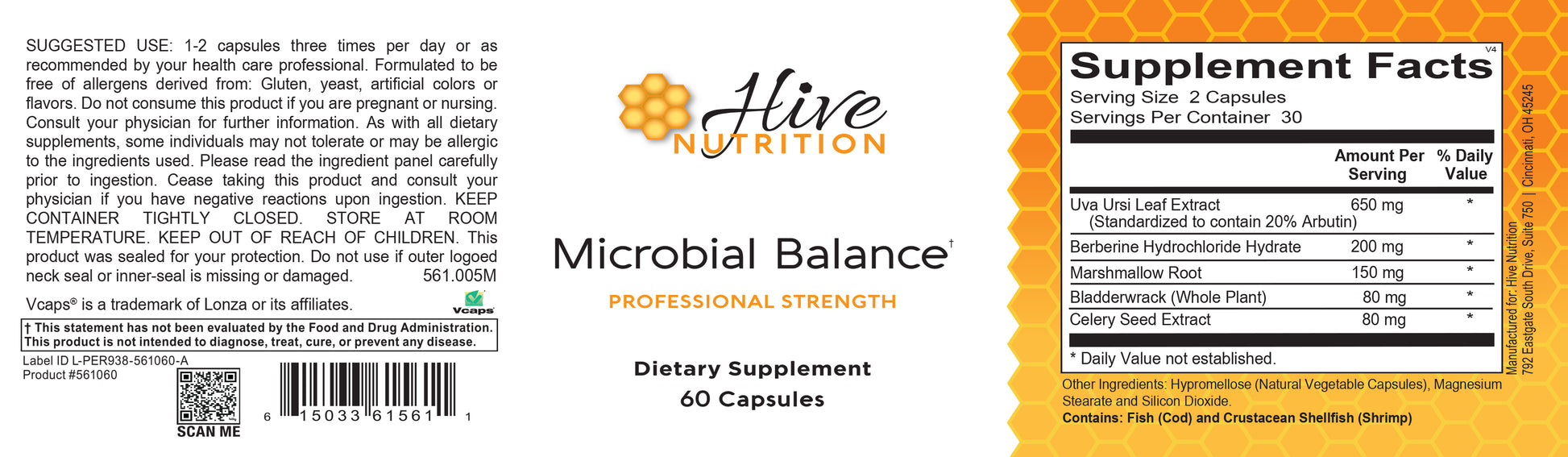 The blend in Microbial Balance is formulated to promote a healthy urinary tract. Key ingredients are uva-ursi, which contains arbutin. Arbutin, when combined with berberine provides a powerful combination to help maintain and restore healthy bacterial balance to the urinary tract.